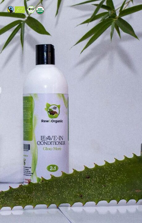 Raw Organic Leave-In Conditioner: 2-in-1 formula for “Glow More” hair. Natural & organic, hydrates, detangles, and reduces frizz.